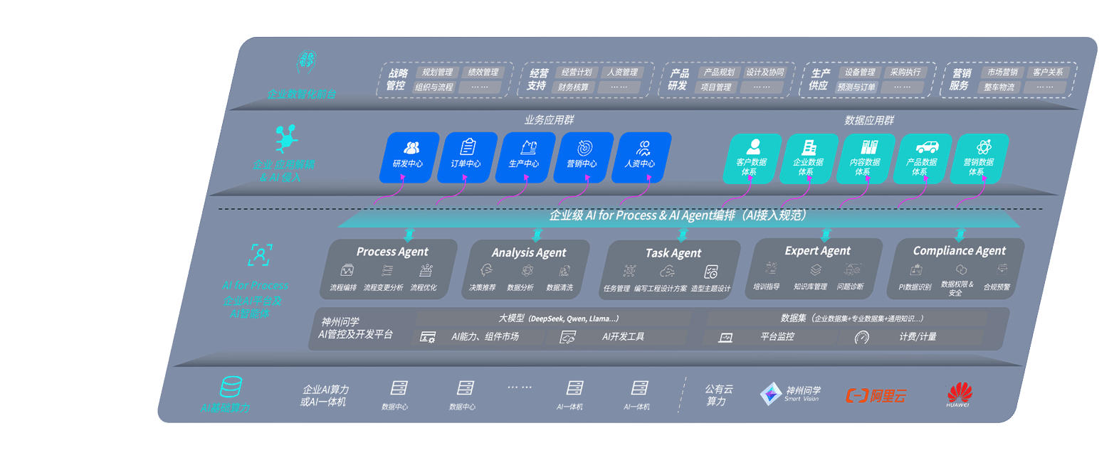 端到端的一站式AI工作空间深度融合了从企业战略规划到日常经营的全流程业务板块,,定向解决车企内部领域多、、部门多、、、链条长、、、、场景碎片化等难题,,,,支持车企快速构建以AI为核心的生产力写作体系,,,,实现任务执行与AI能力的无缝集成与交互