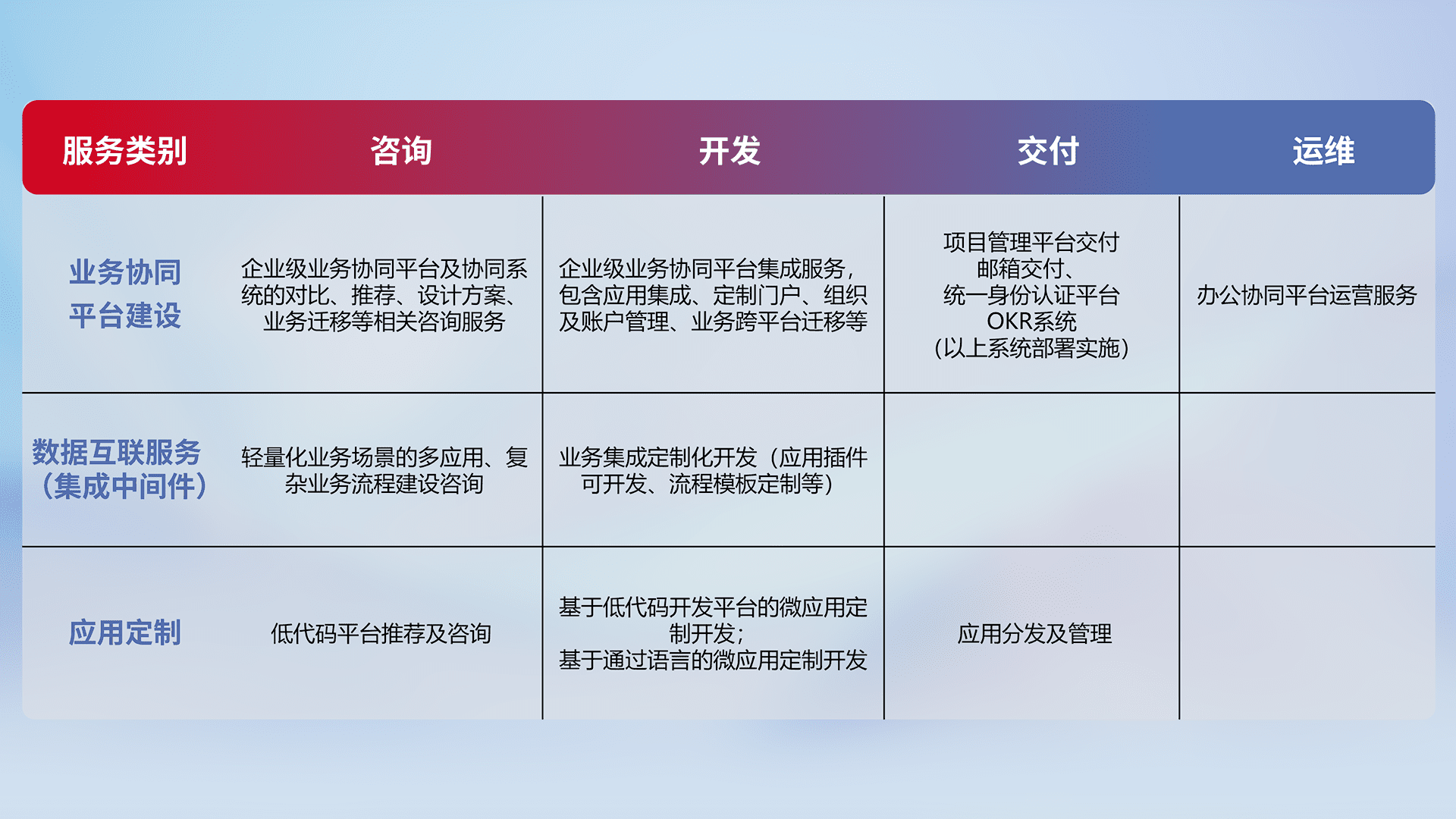 针对钉钉、、、企微、、、、IDaas等平台级产品提供产品的规划、、、、方案、、、交付、、定制化开发等服务,,,实现如统一协同办公、、、智能客户服务、、、、混合会议管理、、、、智能数据查询、、等业务场景,,,,实现数字化转型。。