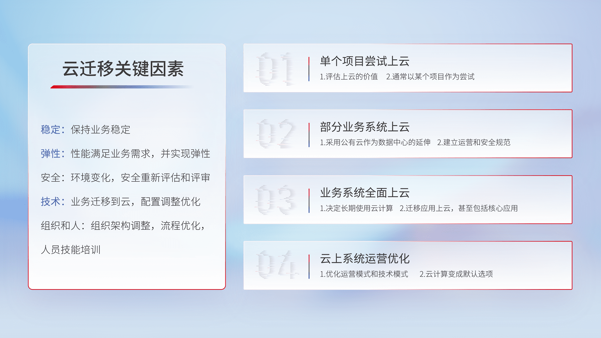 结合实际业务,,从规划设计、、、、云平台选型、、、云原生改造、、、、数据迁移、、集成交付,,迁移全过程为客户识别最佳上云路径,,做好风险识别管理,,设计网络架构、、、身份权限、、、安全审计合规、、、、操作审计、、、日志审计、、监控告警策略、、多站点容灾设计等,,,,对云上基础设施进行整体规划,,,,提升IT治理水平,,以满足弹性、、、高可用、、、高性能的需求。。。。