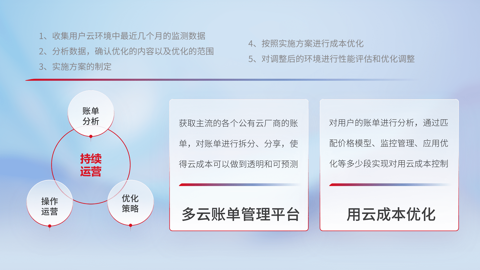 通过多云纳管,,以统一的资源数据模型把客户的云资源进行抽象和封装,,,进而实现对多云资源的统一操作,,保障云资源管理的可靠性、、、稳定性与可用性。。。。量身定制化运维内容,,配置、、、、开发运维、、补丁管理、、、、备份、、、、监控、、、、认证和访问管理、、、审计和日常巡检等,,保障在用云过程中的可靠度,,,,稳定度以及高可用率。。。。
